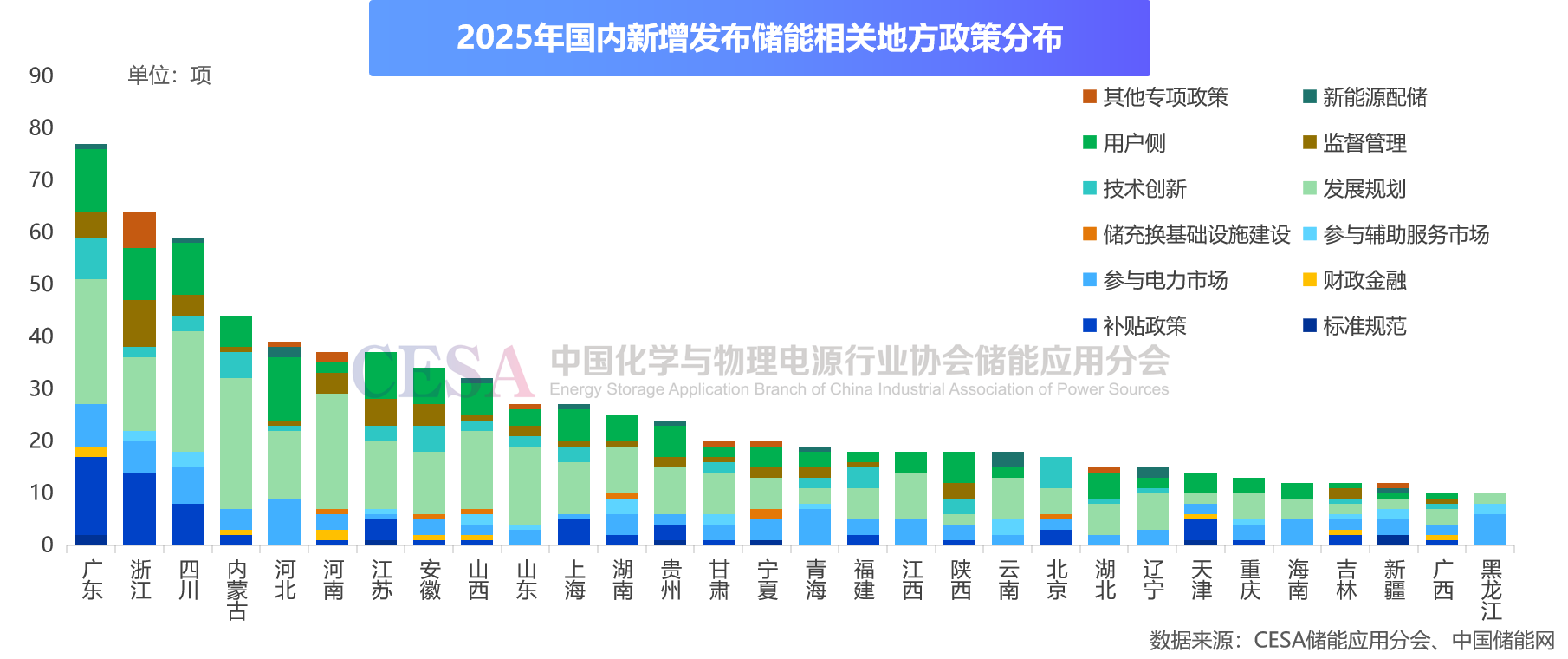 CESA储能应用分会数据显示,2025年,国内共新出台了804项储能直接或间接相关地方政策,其中广东领跑全国,新增77项,数量占比9.6%;浙江新增64项,全国第二。四川新增59项,位列第三。内蒙古、河北、河南、江苏、安徽、山西新增均超过30项。