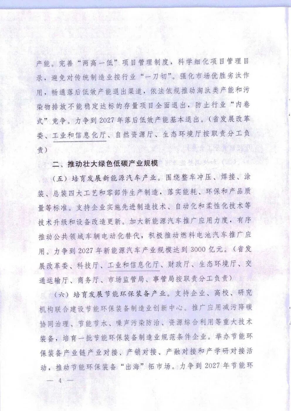 《措施》提出,要把资源环境友好型产业作为制造业绿色低碳发展的关键发力点,加快培育新能源汽车、节能环保装备、氢能、新型储能、新型电池、智算等绿色低碳产业,从增量上塑造制造业绿色低碳发展的新动能新优势。力争到2027年,新能源汽车、节能环保装备产业规模分别达到3000亿元,氢能、新型储能、新型电池产业规模分别达到千亿级,并形成10个以上算力规模达到E级的大型算力中心。